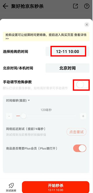 5、在转跳的界面中选择抢购时间,设置抢购参数(这里根据自己的手机延迟进行选择,建议提前50-100)。