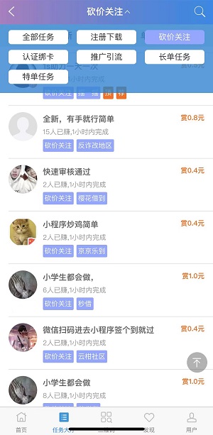 点击下面“悬赏”,选择悬赏类别进入,下拉可以看到很多任务。选择要做的任务,报名参加。按操作完成就可以赚取赏金。