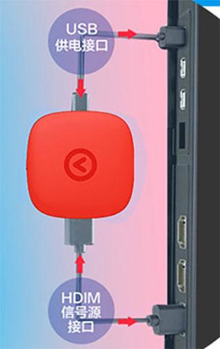 用HDMI线连接电视和天猫魔投,将USB电源线插入电视USB接口(电视机和魔投同步开关机)或在使用手机充电器供电。