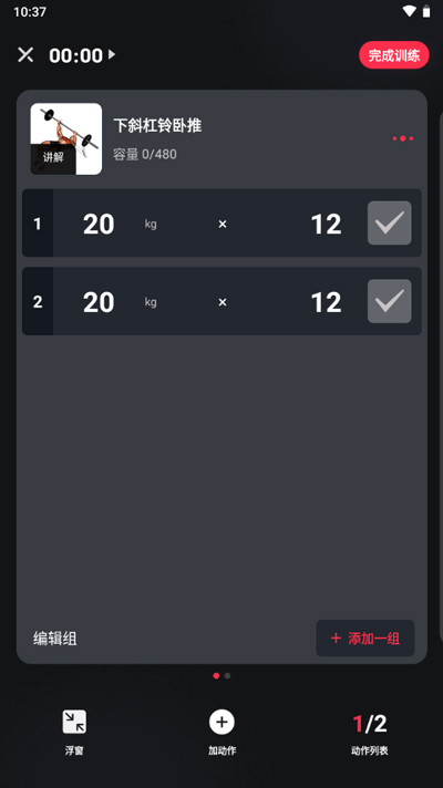 4、添加完成后在编辑页设置锻炼量,最后点击完成训练就可以了。