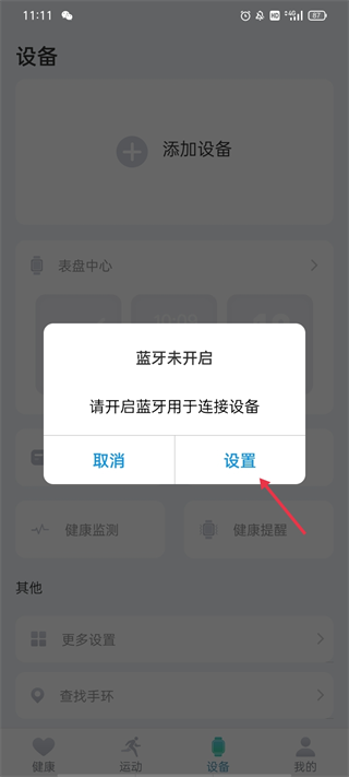 1、打开软件登录账号之后,就会弹出一条提示要开启蓝牙用于连接设备,点击“设置”。