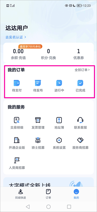 达达快送是一款专业且好用的同城配送服务软件,里面提供全天24小时,同城帮送、同城帮取、同城帮买服务,平均 1分钟下单响应,8分钟上门取件,1h送达全城,只有你想不到,没有帮你买不到的。并且达达快送app的下单功能非常简单易用,在这里用户只需输入寄件人和收件人的地址信息,选择所需的配送服务类型,如普通快递、当日达等,然后确认订单即可。同时,用户还可以通过扫描二维码的方式快速下单,省去了繁琐的填写步骤。