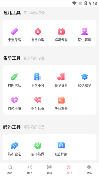 3、发现功能:育儿工具、备孕工具、妈妈工具