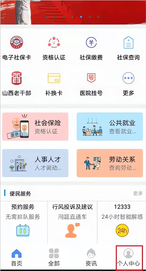 1、在本站下载安装民生山西app,然后打开,点击右下角的个人中心,点击进入;