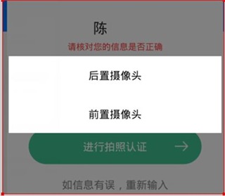 点击“进行拍照认证”按钮,这时会弹出选项摄像头的提示。可以根据使用场景选择前后摄像头,帮助他人认证可以选择后置摄像头,如果自己认证可以选择前置摄像头。