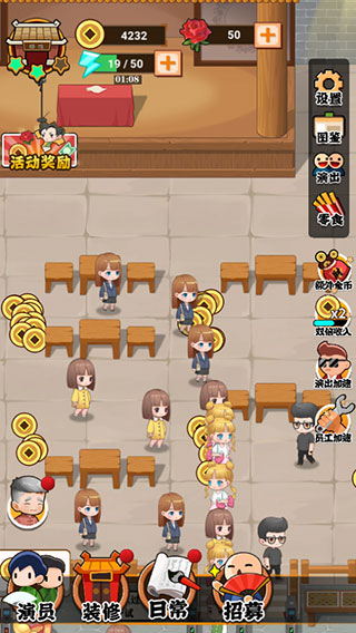 游戏里有挺多特色玩法,比如报菜名,听起来有点老套但我玩着还挺有意思的。你得通过不断赚钱升级茶馆,解锁更多演员和员工,让茶馆的人气越来越高。虽然有时候会遇到一些小问题,但整体体验还是很轻松愉快的。
