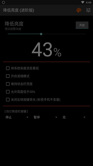 软件还有一些高级功能,比如支持自定义状态栏按键(安卓4.1以上),最多能加三个快捷键,方便操作。还可以调整光线传感器的灵敏度,避免白天屏幕亮度频繁变化的问题。另外,软件还支持Root模式,可以进一步深度调整设置,比如滤镜颜色、快速切换亮度等等。