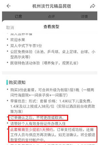 2、点击【查看详情】,了解购买须知,特惠房型(或使用房券)在订单确认之后不可更改或取消,建议在订房之前了解清楚。
