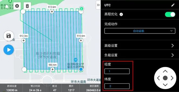 在航测作业中会根据任务要求的GSD设置作业高度,在高度模式选择相对起飞点高度时,先设置被摄面相对起飞点高度,再设置航线高度能更易设置所需高度。