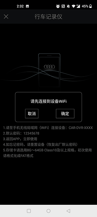 2、在未开启app之前请到wifi设置界面选择行车记录仪wifi(说明书上会标明wifi的名称),输入密码连接(初始密码在说明书上也会标明,进入app后输入密码可修改wifi进入密码,请谨慎操作)。