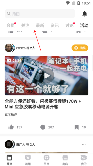 首页板块中可以看到推荐的资讯,也可以查看自己的关注、谈论活动等