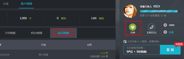 4、充值成功后,可在个人帐号查看钻石数量。钻石明细可以在充值兑换页面查看。