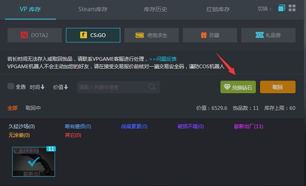 7、兑换完成之后,请在DOTA2或者CSGO的VP库存中查看您的物品,并且可以马上取回,不用等7天。(注意:兑换的CSGO饰品如果在24小时内没有取回,系统会按照原价自动将该饰品兑换为钻石,兑换的DOTA饰品不受影响