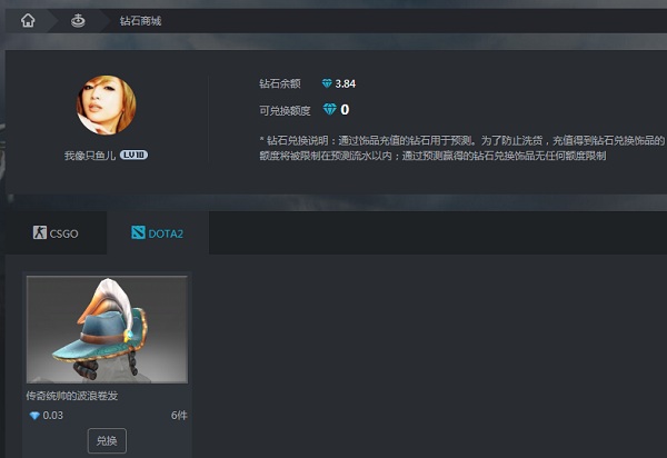 6、点击个人头像下方的钻石图标,进入钻石商城,可选择兑换DOTA2或者CSGO饰品。(注意:存入的钻石必须参与过预测之后才能进行兑换)