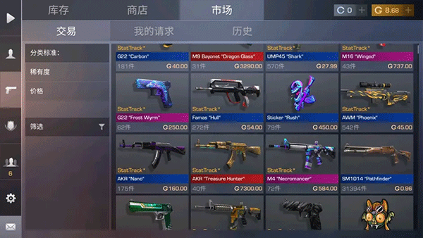 市场用于给玩家互相交易各自的皮肤,游戏皮肤等级分别是:白、浅蓝、深蓝、紫、粉、红,颜色越深价格越高。