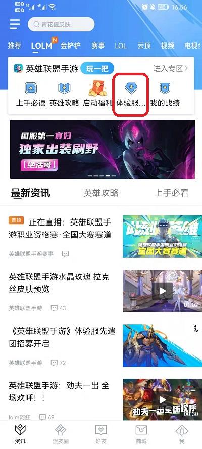 2、进入LOL手游的专属游戏界面,在该界面可以看到上面的【体验服申请】入口,点击一下