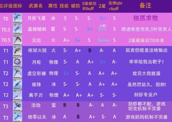 1、月影飞星:冰属性的武器,在破防和技能以及被动的表现上都是十分出色的,说是目前t0武器也不为过,小伙伴们有幸抽到,直接拉满就完事了。