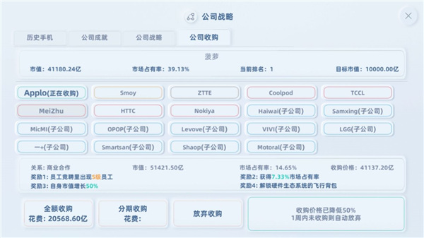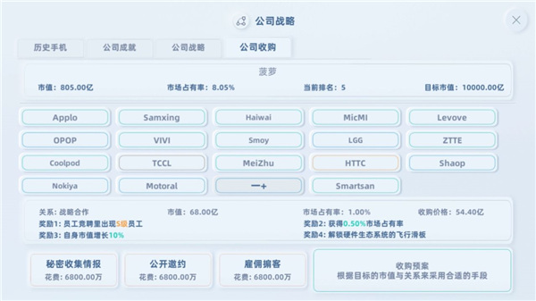市场:这个时候可以转型中端机,中端机的利润会稍高于高端机,当然,也可以干脆不做手机,等收购任务。这个时候你已经富甲天下了,可以考虑收购阿里巴巴或者谷歌什么的,当然,这个游戏不同意,只好拿苹果开刀。6个友商逐步收购,轻松走向人生巅峰。