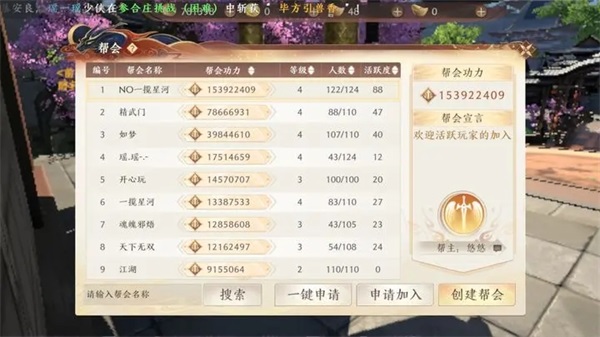 在【帮会】页面,侠客可以选择加入帮会,随机加入【一键申请】,配合【申请】与【申请加入】可以对指定帮会进行申请加入,同时还可以自己【创建帮会】,自己管理。