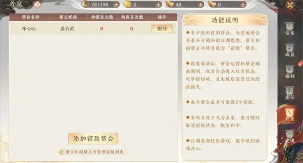6、帮会外交帮主和副帮主,可以确认自己帮会与其他帮会的关系,无需对方同意,最多可以设置5个宿敌。