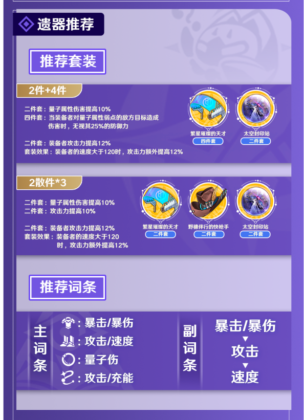 希儿的遗器最优选择为【繁星璀璨的天才】四件套加【太空封印站】二件套,繁星套可以提升希儿的量子属性伤害并使希儿在处理弱点为量子属性的敌人时更高效,太空套可以为希儿提供高额的攻击力加成,且触发条件对于希儿而言很友好。