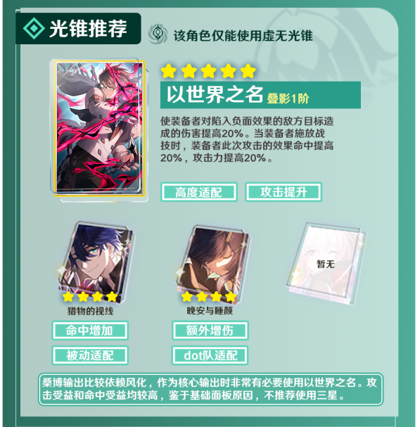 光锥【猎物的视线】可以直接提升桑博的效果命中,让敌人陷入风化状态的纪律提升。