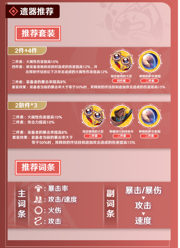 主词条方面,头部和手部为固定的生命值和攻击力属性,躯干选择暴击率,脚部选择攻击力或速度,位面球选择火属性伤害加成,连结绳选择攻击力。