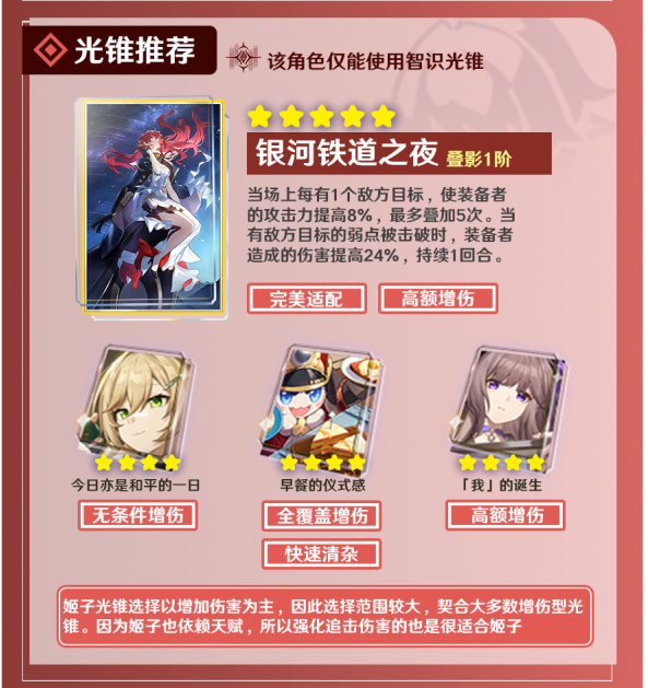 光锥【银河铁道之夜】可以让姬子在面对多个敌人时获得高额攻击力加成且在敌人弱点被击破时姬子还会获得高额增伤,十分利好偏向于对群的姬子且与姬子的天赋联动效果极好。