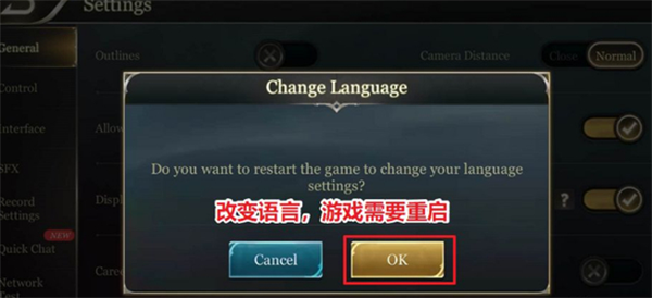 5、选择简体中文后,游戏提示需要重启,点ok重启游戏。