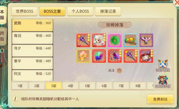 世界BOSS除和平一层外可以击杀三次,当然如果你的VIP等级越高那么那么可以购买的次数就越多。点击BOSS列表的同等级BOSS进入,世界BOSS主要掉落装备、宠物、翅膀幻化、神魔头盔、仙源玉、棋台椅、棋台桌还有套装石和完美套装石,建议大家开和平进入,或者组队争取拿到归属,组队时可人均拿到一份珍惜奖励的。