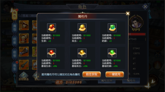 游戏中,角色的属性丹分为六种:生命、生命百分比、攻击、攻击百分比、防御、防御百分比。不同的属性丹将提升角色的相应战力属性。