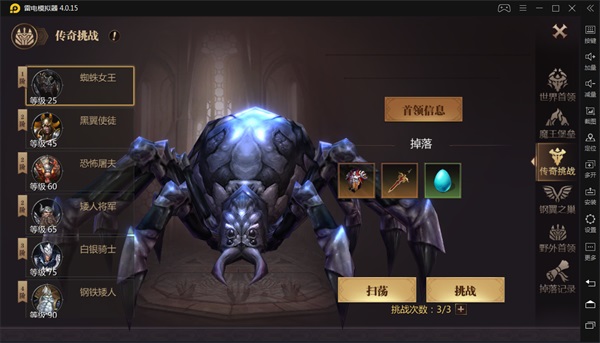 由此可以看出传奇怪物之间的等级跨度还是很大的,后期甚至要30级才会有新的BOSS! 而且由于传奇挑战每天只有三次挑战的机会,所以奉劝大家在准备妥当之后再去挑战,不要浪费了这个获取强力装备的大好机会。