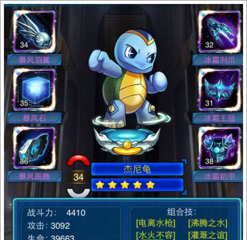 杰尼龟是一个超级肉盾,尤其是进化+5之后可以复活一次,肉的令人发指,不过杰尼龟缺点就是输出太低,由于基础攻击低,加成并不可观,所以还是让他变成一个超级堡垒最好,为小伙伴创造输出的环境。推荐加血的装备,绝对恶心。