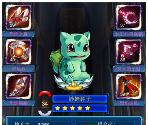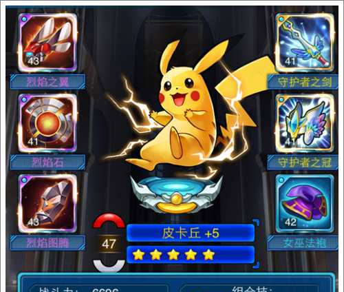 皮卡丘是一个超强的输出,攻击组合全开,再加上合理的套装比如女王套装、烈焰套装、暴风套装,是绝对的输出主力,在进化+5之后甚至可以和7星的精灵相媲美,不愧是带有主角光环的小精灵。我建议皮卡丘的装备:守护套装(五星(首冲获得))+烈焰套装(四星,如果没有烈焰套装,女巫四件也行),这个搭配可以有25%吸血属性,在前期攻击六个敌人,吸血可以达1万+,在前中期几乎只要不被打死就能吸血吸满。