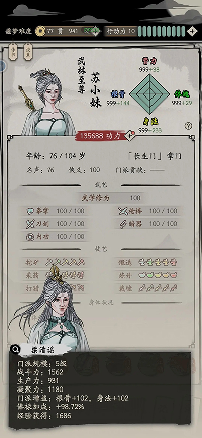 ⑤江湖传闻每年都是随机刷新,如果追求极限,可以每年都SL称号相关的事件,这个加的属性是在四属性999额外的属性。丹药也好,功法也好都是加999之内,达到999后再升功法、吃丹药也不加属性。