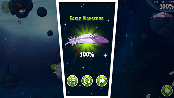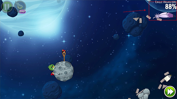 太空穿梭鸟(原黄色的三角形鸟)拥有非同凡响的天赋,当它被发射到中途的时候,轻轻点击一下屏幕,它就会进行直线式的冲刺攻击!犹如导弹一般,以恐怖的速度冲向绿猪,威力极大!不过,加速的时机很难掌握,否则很可能会飞出打击目标,无法制造精确打击。但一旦掌握好使用方法,愤怒的小鸟就会真正地愤怒起来,给木质结构的猪堡制造极大的破坏。