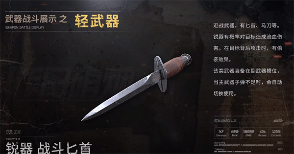 近战武器,有匕首、马刀等。锐器有概率对目标造成流血伤害。在目标背后攻击时,有偷袭效果。