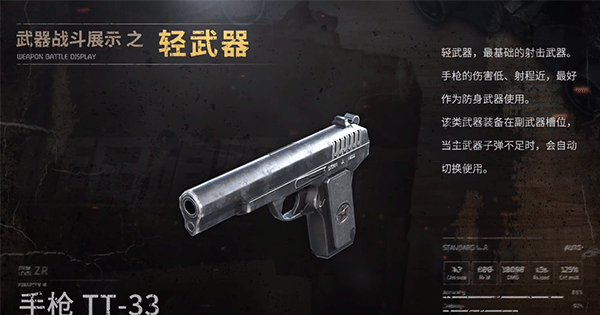 轻武器,最基础的射击武器。手枪的伤害低、射程近,最好作为防身武器使用。