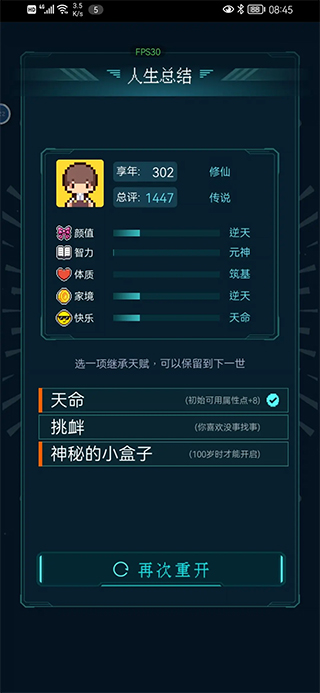《人生重开模拟器天命之子版》是一款超有意思的手机游戏,让你体验重生的乐趣。从出生开始就能选择各种属性,比如体力、性格、家境等等,还能在不同年龄段面临人生考验和选择,感受完全不同的人生结局。游戏玩法简单,点击就行,过程很快,而且内容很真实,从出生到结婚生子都会遇到一系列问题,非常贴近现代社会的现状。