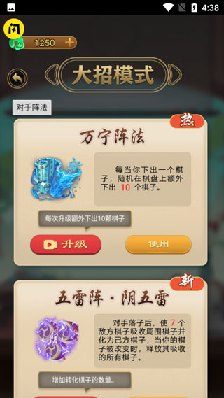 万宁五子棋2大招版这款发布在闪玩上的全新的五子棋游戏,与我们熟悉的五子棋玩法不同,里面增加了大招玩法,连招玩法,也是抖音上的热门游戏万宁五子棋的又一力作。游戏除了有前作的万宁阵、五雷阵、血狱影杀阵、八卦阵等诸多阵法大招外还全新加入了七星阵、超斗阵、归元阵、五雷阵·阴五雷这几个阵法,每个阵法的作用都不相同并且这些大招也是可以升级的,等级越高,获胜的几率就越大,十分有趣,可玩性极高。感兴趣的朋友可以在本站下载游戏哦!