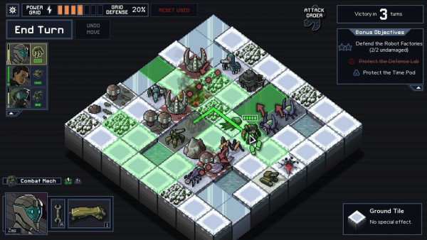 像下棋一样,“举棋未定”,通过观察攻击及其结果是很有帮助的。可以多次使用撤销按钮来移动你的机甲,但是一旦你发起攻击,就不能回头了。只有当制定出最具潜在伤害的行动并使受到威胁的建筑得到有效保护后,才开始攻击。