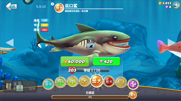 5、加大级鲨鱼:可以吃蓝水母,破坏绿柱子。有巨口鲨,虎鲨等。