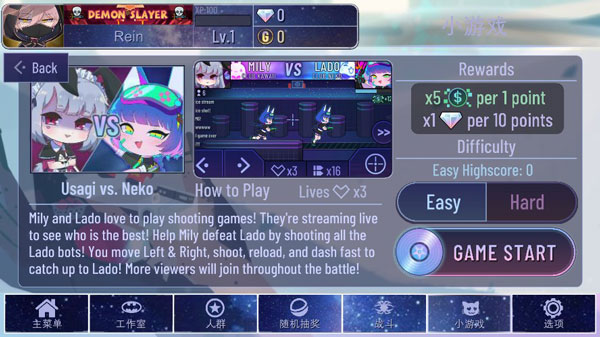在这个小游戏中玩家需要操控界面上代表Mily的准星,左右移动或冲刺来射击出现的代表Lado的敌人。 玩家在本游戏中有3次机会,20发子弹。用完20发子弹后,2秒后自动补充满。 界面右上角有时间槽,玩家击中一个敌人时间就会减缓,如果时间到后将会减去一次机会。 Easy难度下每1分可获得5倍Bits,每10分可获得一个Gems;Hard难度下每1分可获得6倍Bits,每10分也可以可获得一个Gems。