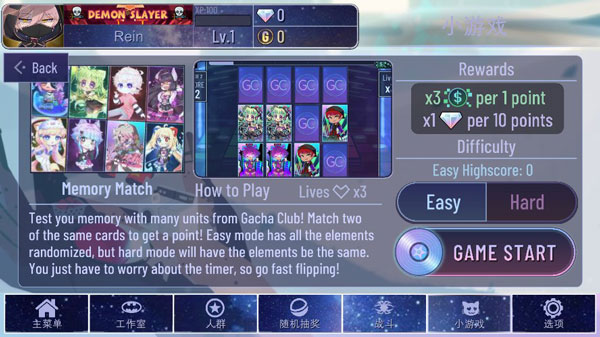 在这个小游戏中玩家需要从这一组隐藏的卡牌中翻出两个能互相对应的卡牌。 玩家在本游戏中有3次机会,如果时间到则扣一次,扣完即止。 Easy难度下每1分可获得3倍Bits,每10分可获得一个Gems;Hard难度下每1分可获得4倍Bits,每5分可获得一个Gems