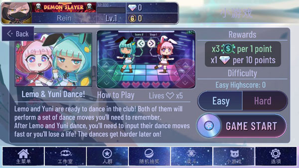 在这个小游戏中Lemo和Yuni两人会以一组舞步来示意接下来要求让玩家输入的箭头(两侧,上下左右)。 玩家在本游戏中有5次机会,其中一个出错则扣一次,扣完游戏结束。 Easy难度下每1分可获得3倍Bits,每10分可获得一个Gems;Hard难度下每1分可获得4倍Bits,每5分可获得一个Gems。