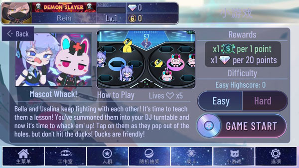 与打地鼠类似的模式,在这个小游戏中Bella和Usalina会从界面中的DJ工作台上左右两个碟子中的6个孔出现,其中还包括鸭子。 玩家在本游戏中有5次机会,漏一次或打中鸭子则扣一次,扣完游戏结束。 Easy难度下每1分可获得2倍Bits,每20分可获得一个Gems;Hard难度下每1分可获得1倍Bits,每20分可获得一个Gems。