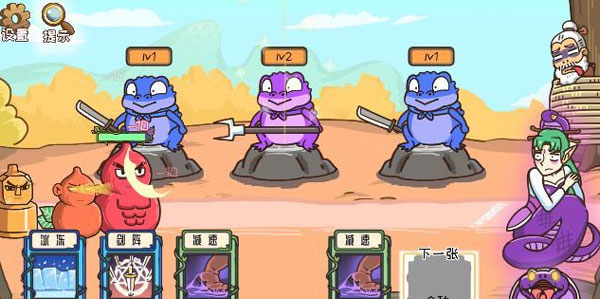 1、先把蛤蟆兵卡牌,放到上方的塔防位置,阻挡葫芦娃的进攻,总共有7个葫芦娃。相同卡牌之间可以直接合成高等级的卡牌。