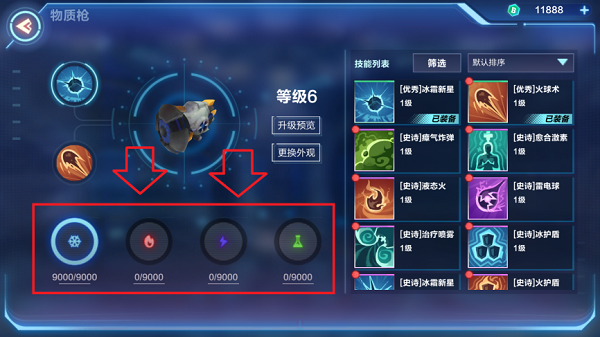 另外,需要注意的是在经常使用技能后,新手会发现技能无法使用,那是因为你的元素不够了。打开物质枪界面,就会发现不同元素有不同的数字,这个数字等于就是蓝量,每次使用技能的时候都会对它进行消耗,当耗尽的时候就无法使用技能,所以在副本战中需要合理的分配技能的使用。