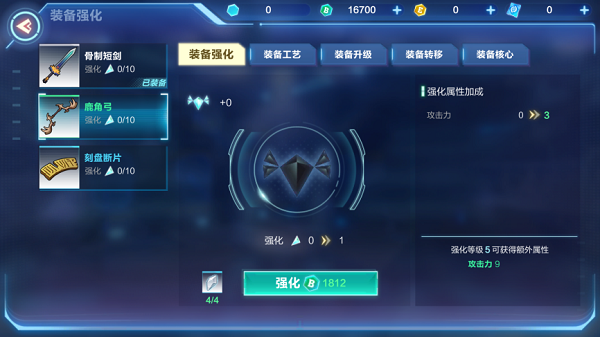 强化需要用到比特和闪耀晶石(两种材料均可在日常活动中获得,也可以通过购买获得),强化会有强化属性加成随着强化等级达到一个新的阶段的会有额外属性加成,强化界面左上角的+0便是指还没达到任何一个阶段,每达到一个阶段,数字便会增加1。