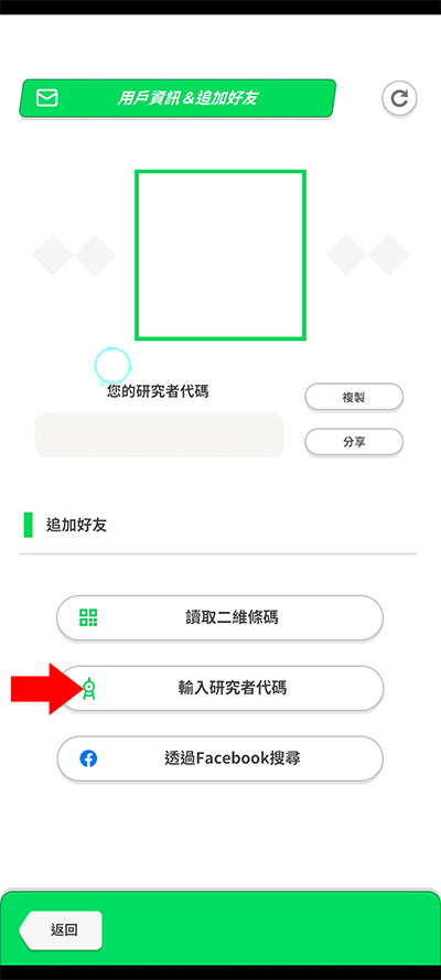 4、进入下方界面后,可直接复制我们的研究者代码让其他玩家添加我们,也可以在下方输入其他玩家的研究者代码来添加好友